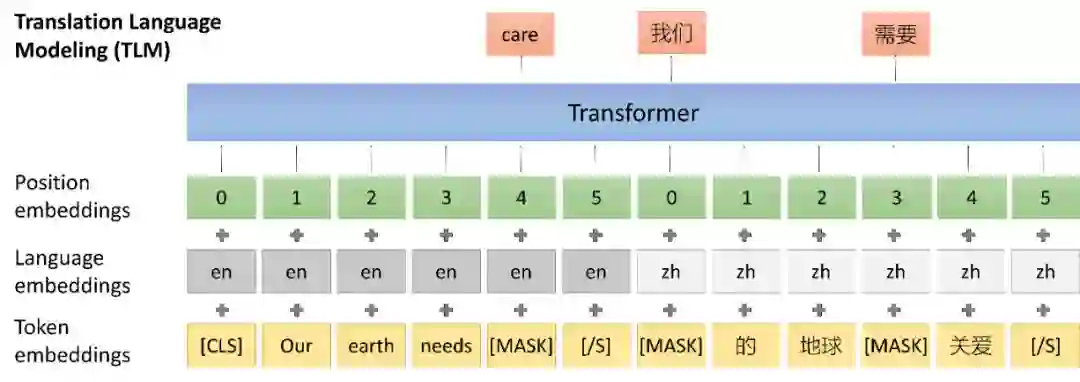 XLM [4]在 Multilingual BERT 的基础上,增加了一个新的任务,Translation Language Model。该任务将机器翻译语料中的双语句对拼接成一个新的句子,然后在这个句子上进行 Masked Language Model 的预训练。通过这一任务,XLM可以学习到两个语言之间的对应关系,从而获得比 Multilingual BERT 更好的跨语言迁移能力。