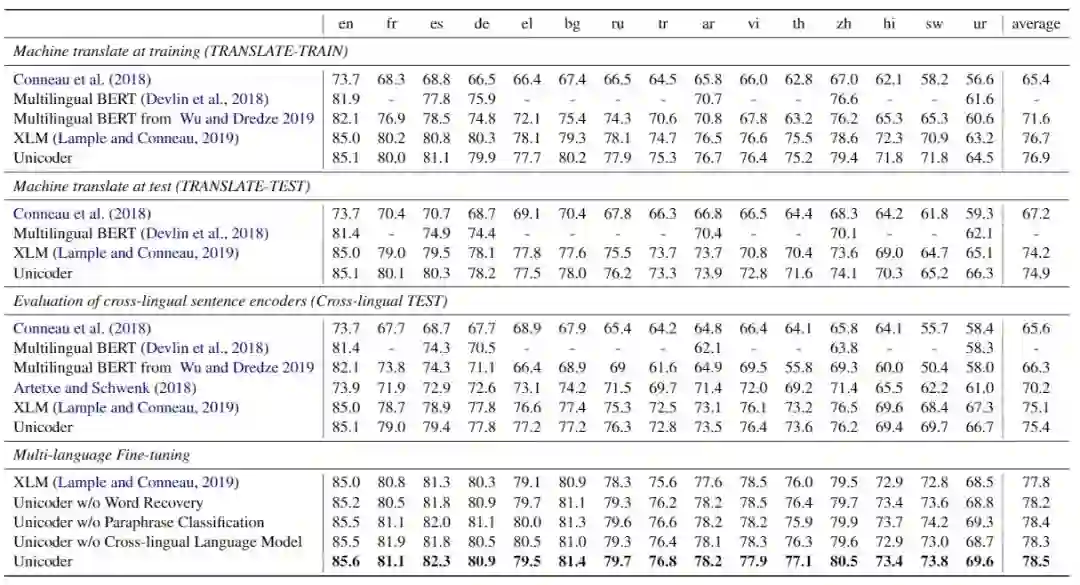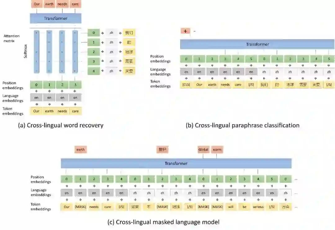 Unicoder [5]在XLM 的基础上,进一步提出了三个新的任务,使模型能够更好的学习语言之间的对应关系。三个任务分别是:跨语言的词语恢复,跨语言的同义句子分类和跨语言的 Masked Language Model。三个任务分别定义在词语、句子和段落级别,可以让模型从不同的层次学习两个语言的对应关系。