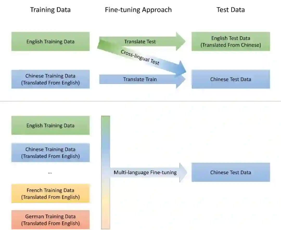 • 测试数据翻译(Translate Test)将中文的测试数据翻译成英文的测试数据,将问题转化成英文训练、英文测试的问题。