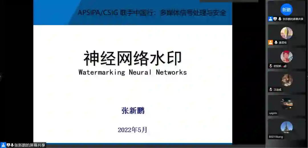 张新鹏教授的报告主题为“神经网络水印”。深度神经网络模型的知识产权保护已引起了研究者的重视,张新鹏教授在报告中航介绍了基于内在的白盒神经网络水印、基于触发集的黑盒神经网络水印、基于输出结果的无盒神经网络水印等主流方法,并展望了神经网络水印的未来发展。