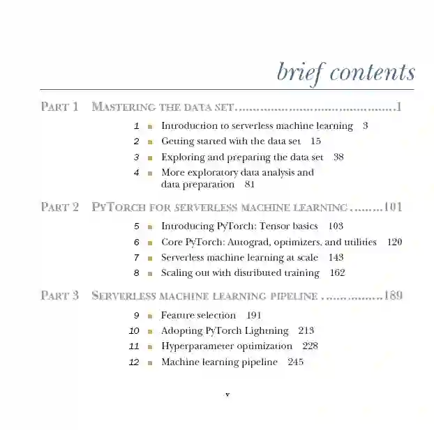 本书由三部分组成。在第1部分中,我列出了将机器学习系统投入生产的场景,描述了实验机器学习代码和生产机器学习系统之间的工程差距,并解释了无服务器机器学习如何帮助弥合这一差距。的第1部分,我将教会你如何使用公共云的serverless特性(Amazon Web Services)开始使用一个真实的机器学习用例,准备一个工作机器学习的数据集的用例,并确保你准备机器学习应用到用例。在第2部分中,我将介绍如何使用PyTorch深度学习框架为结构化数据集开发模型,解释如何在云中分布和扩展机器学习模型训练,并展示如何部署经过训练的机器学习模型以根据用户需求进行扩展。在此过程中,您将学习评估和评估替代机器学习模型实现的性能,以及如何为用例选择正确的机器学习模型。在第3部分中,我将向您介绍机器学习实践者经过战斗测试的技术,并涵盖特征工程、超参数调整和机器学习流水线组装。读完这本书,您将建立一个机器学习平台,它吸收原始数据,为机器学习做好准备,应用特征工程,并训练高性能、超参数调整的机器学习模型。