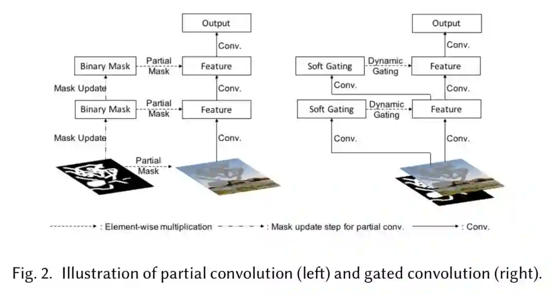 上述的Partial Convolution方法虽然不全效果好, 但是随着网络层数的增加, 器Mask矩阵中的遮挡的部分会越来越萎缩, 到最后每一层的Mask矩阵就认为没有遮挡了, Free-Form Image Inpainting with Gated Convolution[5] 则在此基础上进行了改进, 将Partial Conv方法的Mask更新改为从图片中学习, 并不再将Mask中元素的值固定为0,1而是取自[0,1]. 二者的比较见下图: