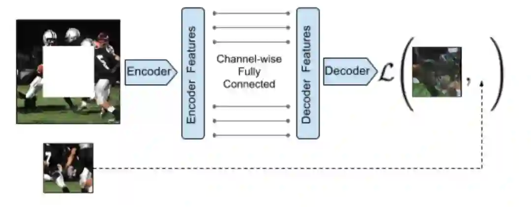 首先是2016年的Context Encoder[1]方法, 该方法设计了了一个Encoder-Decoder结构的神经网络从遮挡图像的未遮挡部分来推断遮挡部分的信息, 具体的网络结构如下图所示:
