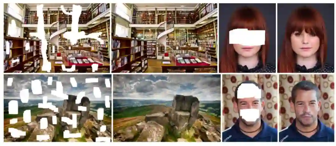 该方法的损失函数包含全局与局部判别损失以及重建损失, 不仅在补全区域的细节方面生成的比较好, 而且还可以通过巧妙地设计损失处理不规则的遮挡区域. 一些效果如下图: