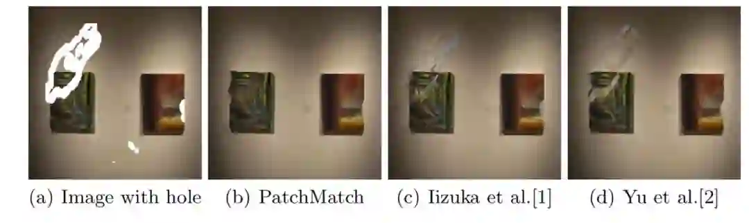在使用深度学习方法进行图片补全的时候, 一般将缺失的区域使用白色或者是随机噪声来填充, 再使用卷积层来提取上下文特征以及后续的补全. 白色/随机噪声本来没有有效信息, 对它们与有效的信息不加区别的卷积并不合理, 这样的补全结果会出现一些副作用, 如下图所示: