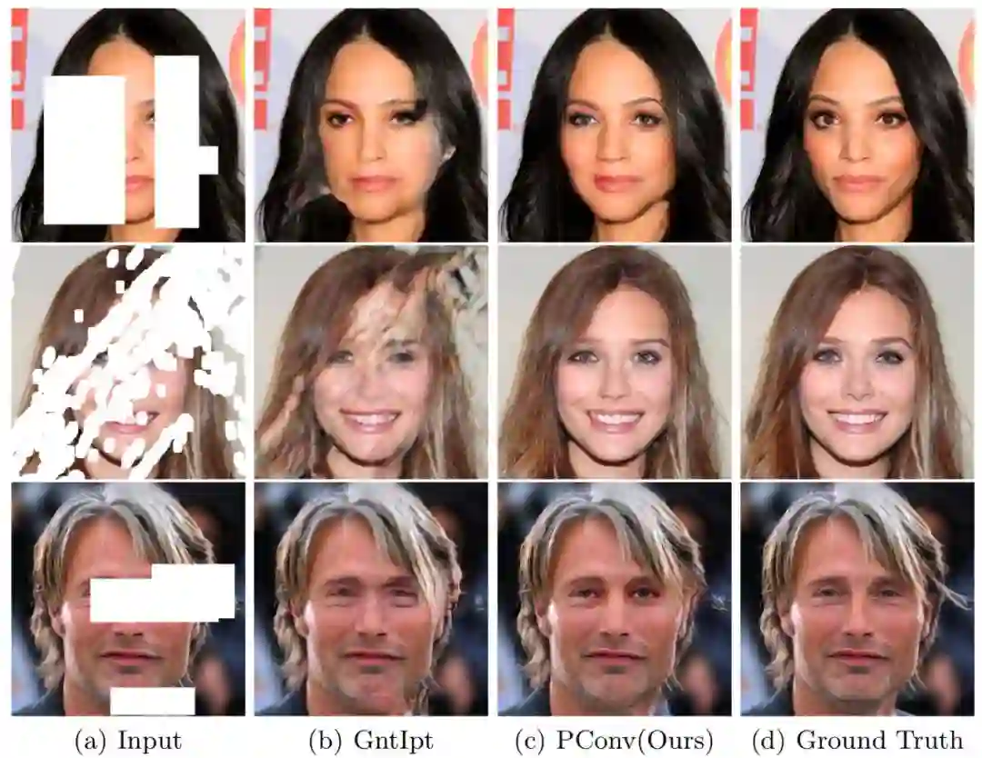 式中的W是卷积核, X是一个卷积核上对应的图片内容, M是一个卷积核上的含遮挡信息的Mask矩阵, 元素只含0,1; 右边的m’就是每层更新Mask矩阵的方法. 该方法的一些补全效果如图: