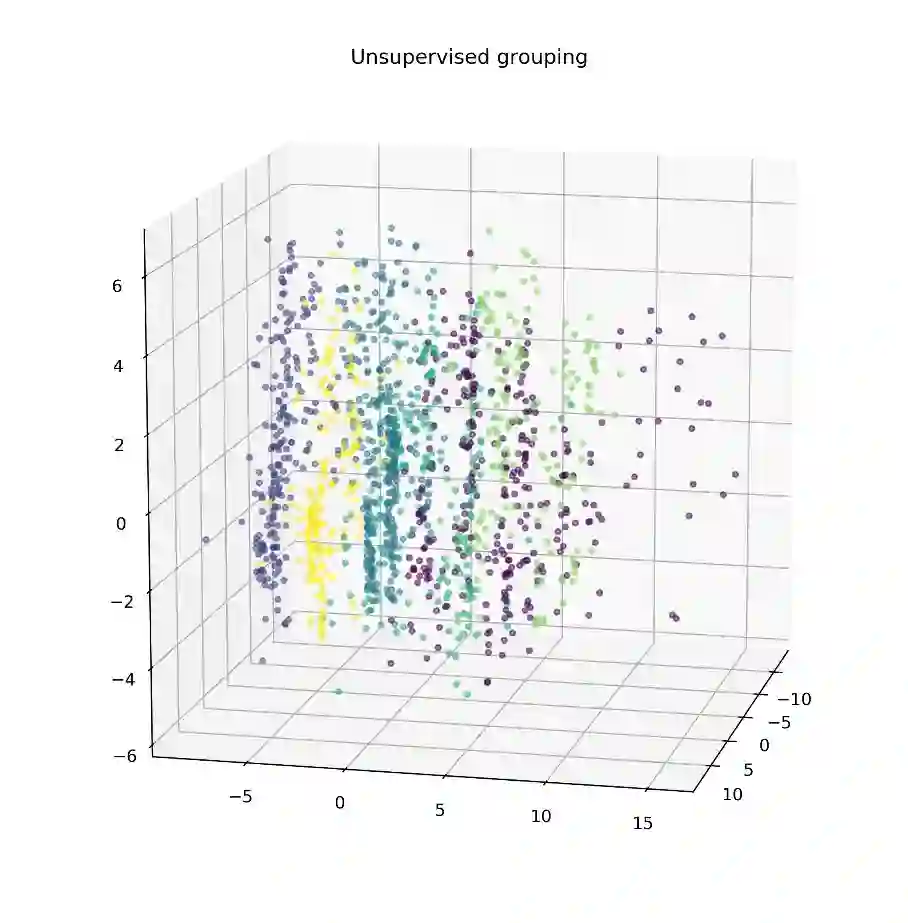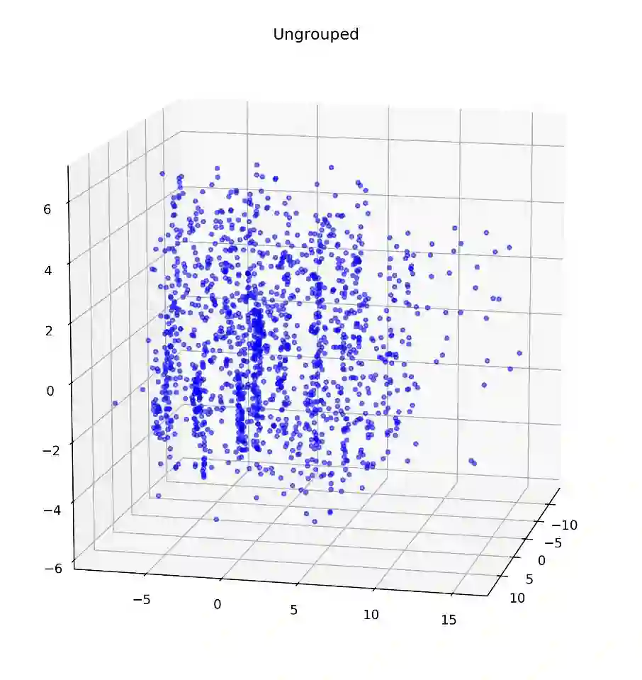 通过对此图的初步观察,数据大部分的差异体现在新的Y(垂直)维度。在X(宽度)和Z(深度)维度中,差异来源于设定的类别,进而导致数据形成垂直方向的条纹。由于群集的各向异性,我们利用有k-nearest neighbor connector参数的层次聚类算法来定义组,这样就不会将条带分割成多个部分。(我们利用层次聚类算法中的k邻近算法,在不把竖状条纹割开的基础上重新定义各个组。)(在Python的sklearn库中,AgglomerativeClustering方法可以用于聚类。本案例中,基于Ward linkage标准把类的数量设置为6,以及由kneighbors_graph包生成连接数组,其中参数n_neighbors设置为20)。