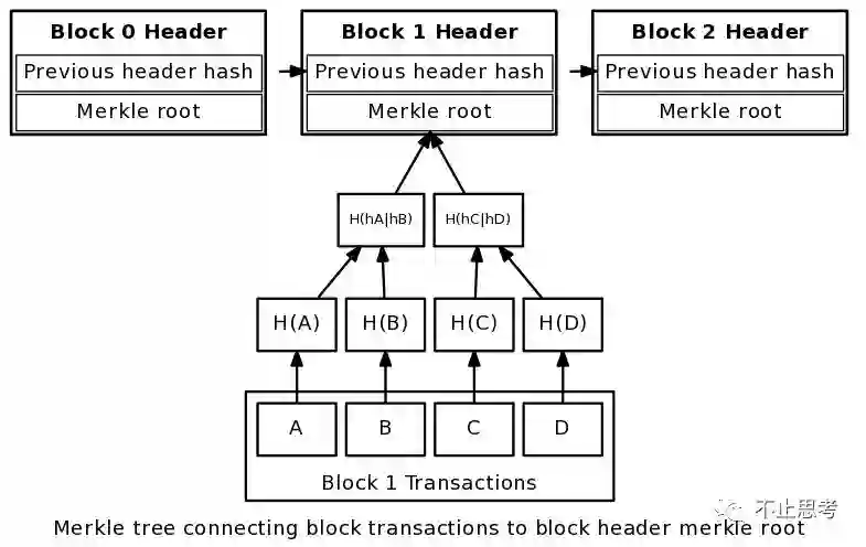 比特币中对每一笔交易做一个hash计算,然后把每2个交易的hash再进行合并做hash,如图中的 交易A的hash值是 H(A),交易B的hash值是H(B),再对这2个交易合并hash后就是H(hA|hb),就这样一直往上合并计算,算到最后的根部就是 Merkle Root 了。