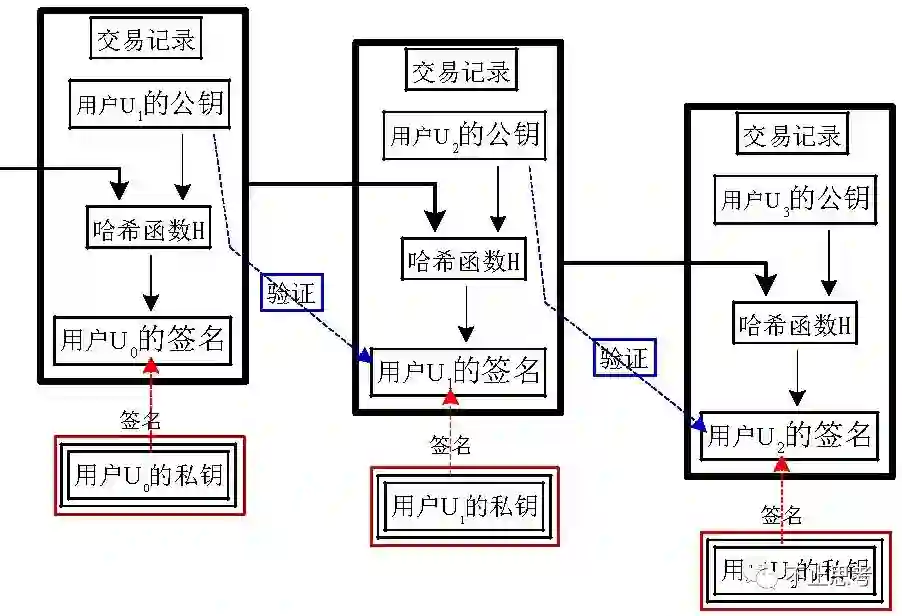 用户U0 使用哈希算法将交易信息进行计算,得出 H = hash(data),然后再使用自己的私钥对 H 进行签名,即 S(H),这一步其实是为了防止交易信息被篡改用的