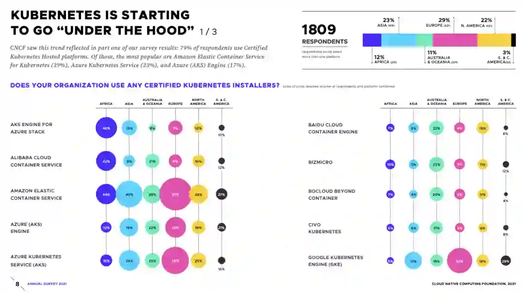 调查显示 79% 的受访者使用经过认证的 Kubernetes 托管平台。其中,最受欢迎的是亚马逊 Kubernetes 托管服务 Amazon EKS、Azure (AKS) Engine。