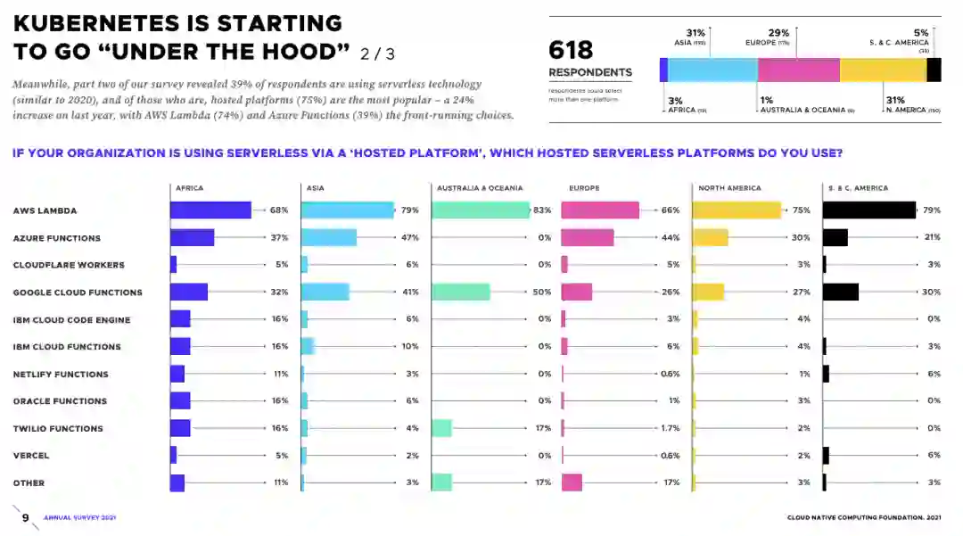 调查的第二部分显示,39% 的受访者正在使用无服务器技术,与 2020 年相差不大,其中托管平台最受欢迎,AWS Lambda 和 Azure Functions 仍是主流选择,相比去年都有不小的增长。
