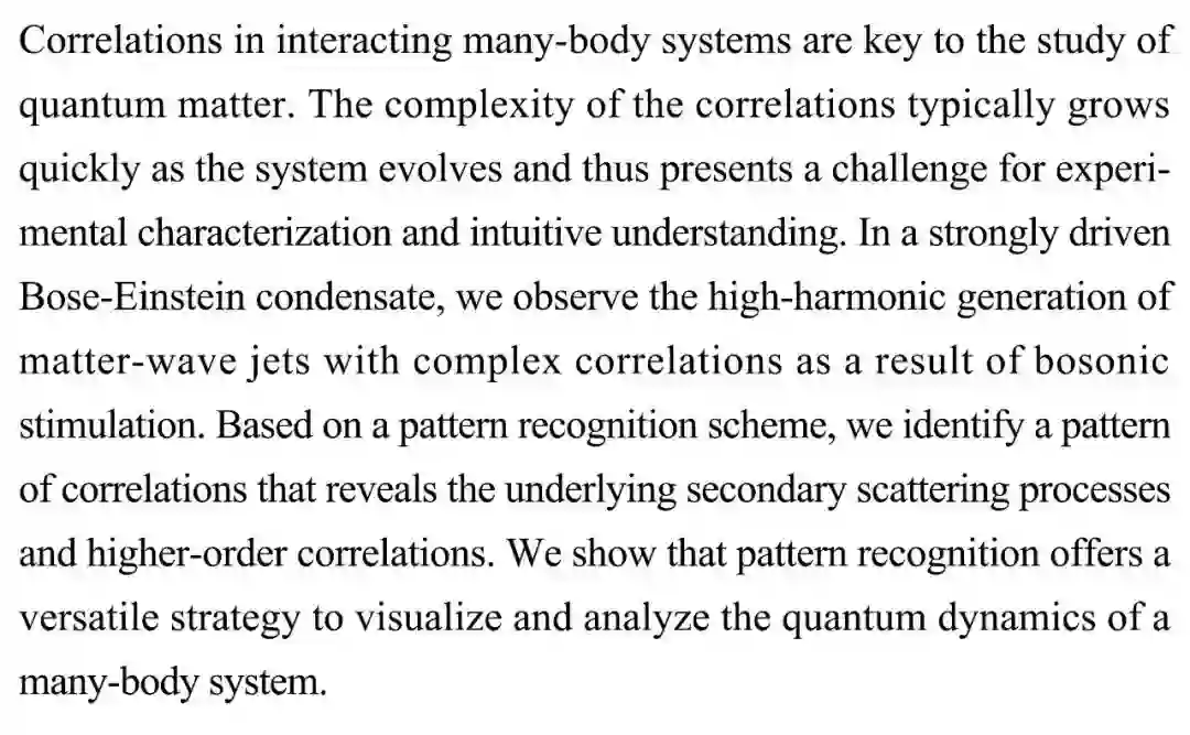 (导读 刘奇)多体系统中的交互相关性是研究量子物质的关键,但其复杂性会快速增加不利于实验表征和直观理解。本研究在强驱动Bose-Einstein凝聚体中观察到玻色子激发产生的具有复杂相关性的物质波射流的高次谐波。通过模式识别方法研究人员揭示了潜在的二次散射过程和高阶相关性。研究结果表明模式识别可以为多体系统的量子动力学分析提供一种通用策略。