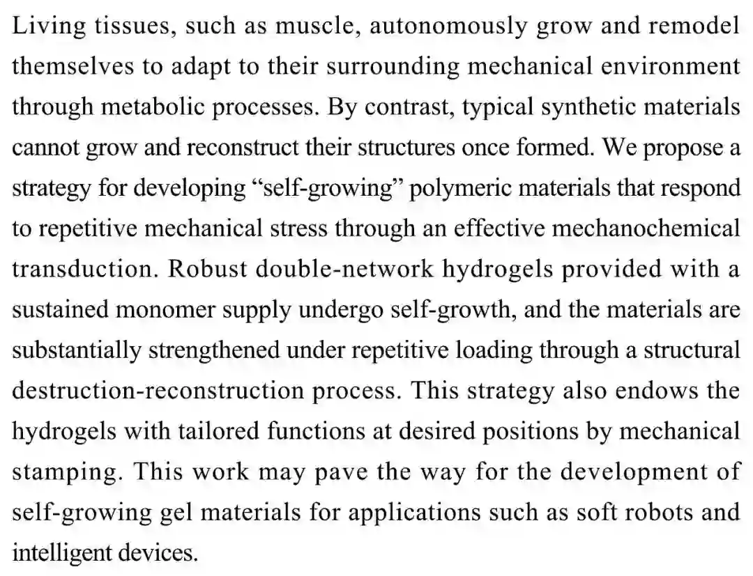 (导读 薛炜楠)肌肉等活体组织可以通过自主生长和重塑自身以适应其周围的机械环境,但是传统的合成材料不具备这种性质。本研究开发了一种自生长聚合物材料,组成材料的双网络水凝胶和持续供应的单体通过结构的破坏和重建进行自生长。该研究可能推动应用于软机器人和相关智能设备的自生长凝胶材料的发展。