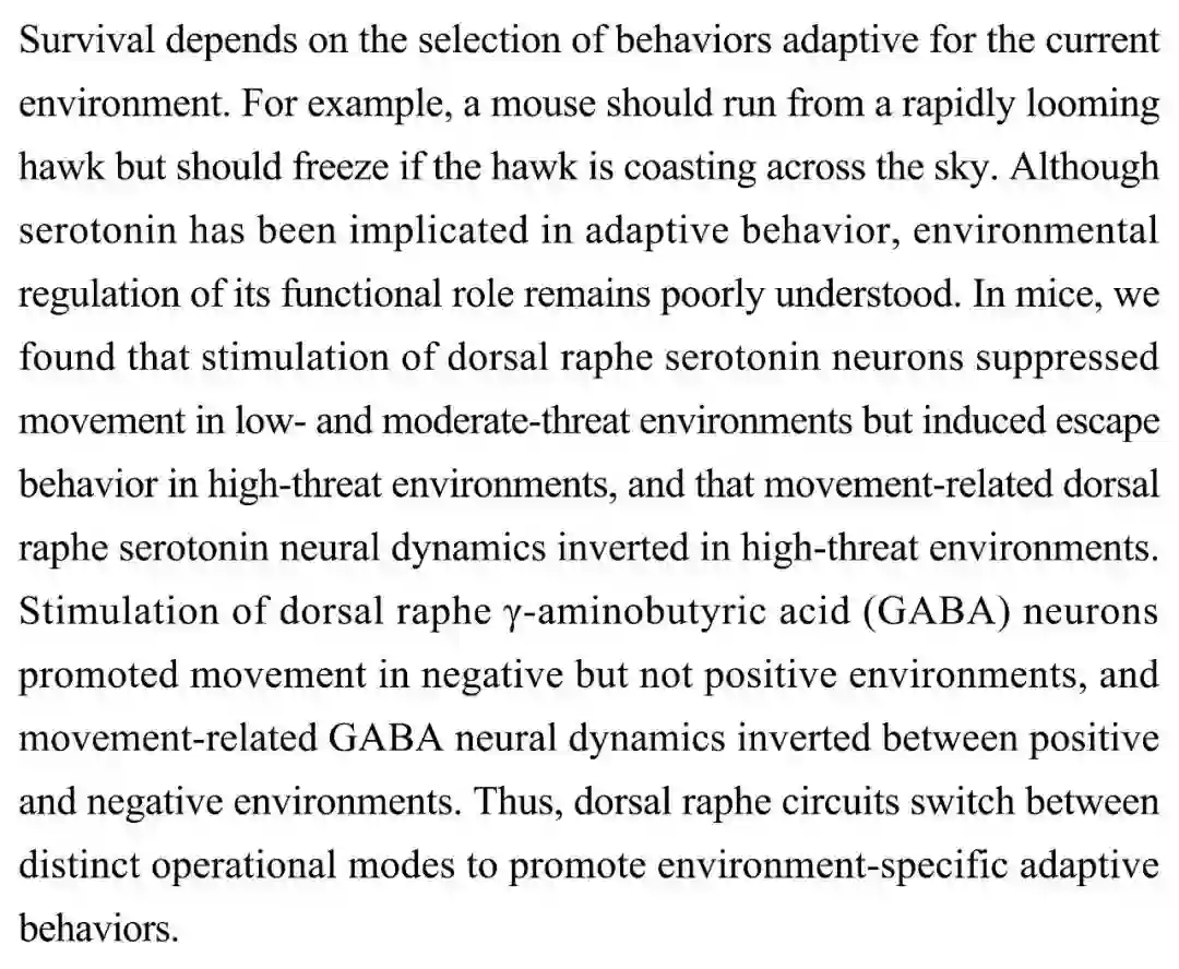 (导读 阿金)生存取决于选择适应当前环境的行为。虽然血清素与适应行为相关,但其功能作用的环境调节机制尚不清楚。本研究在小鼠中发现刺激中缝背核血清素能神经元在中低等级威胁环境中会抑制运动,但在高威胁环境中可诱发逃跑行为,移动相关中缝背核血清素的动态变化也出现颠倒。该结果表明中缝背核神经回路在不同运行模式间的切换促进特定环境的适应行为
