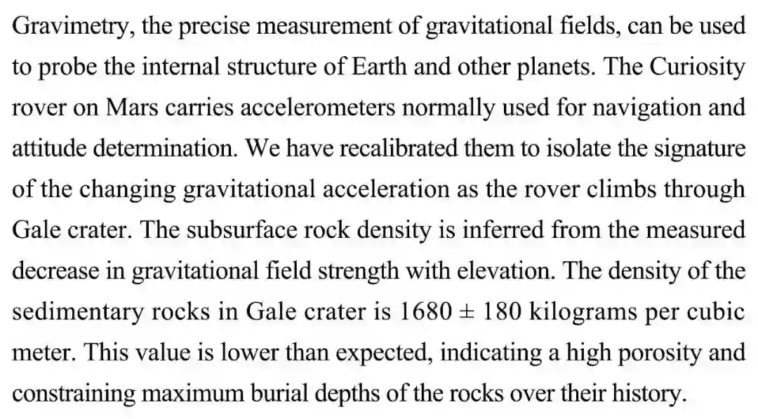 (导读 阿金)重力测量可用于对引力场的精确测定。利用位于火星“好奇号”装载的加速计,本研究对“好奇号”翻越盖尔火山口时重力加速度变化的特征数据进行分离,测得火山口沉积岩密度为每立方米1680±180千克。该数值低于预期值,表明岩石在历史上拥有高空隙率和有限的最大埋藏深度。