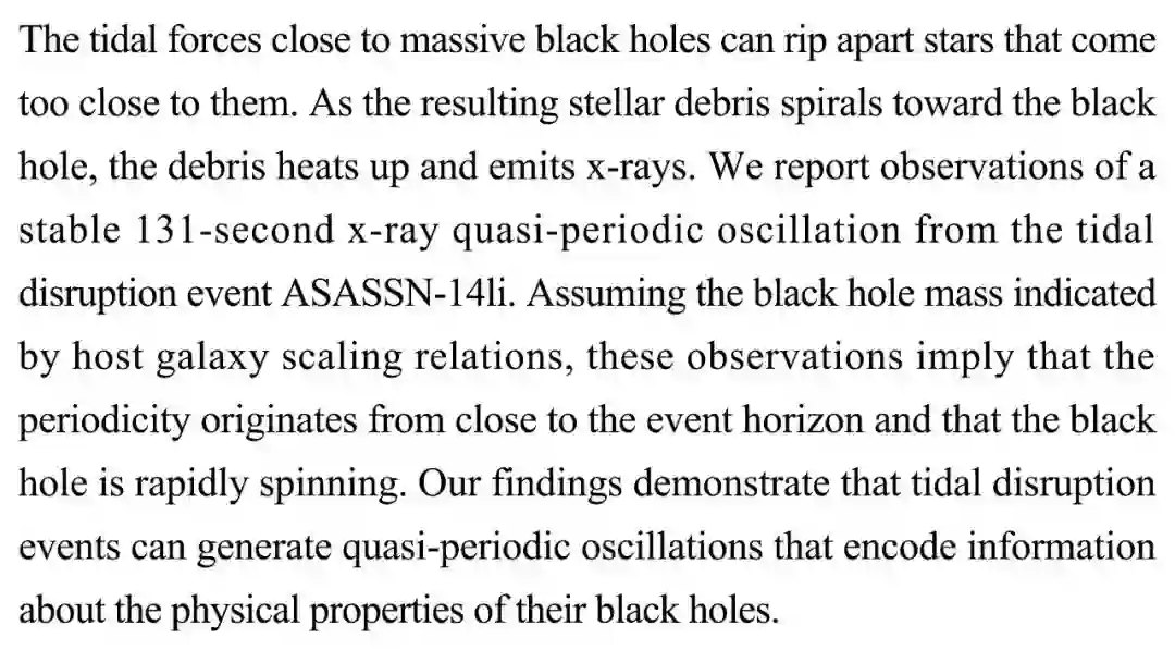 (导读 胡琦琳)靠近大质量黑洞的潮汐力可以撕裂离黑洞很近的恒星,产生的恒星碎片以螺旋轨迹朝向黑洞,被加热并释放x射线。本研究报告了来自ASASSN-14li潮汐撕裂事件中长时间稳定存在的周期为131秒的x射线准周期震荡信号。该发现表明,潮汐撕裂事件可以产生准周期震荡,并可能将有关黑洞的物理信息编码在其中。