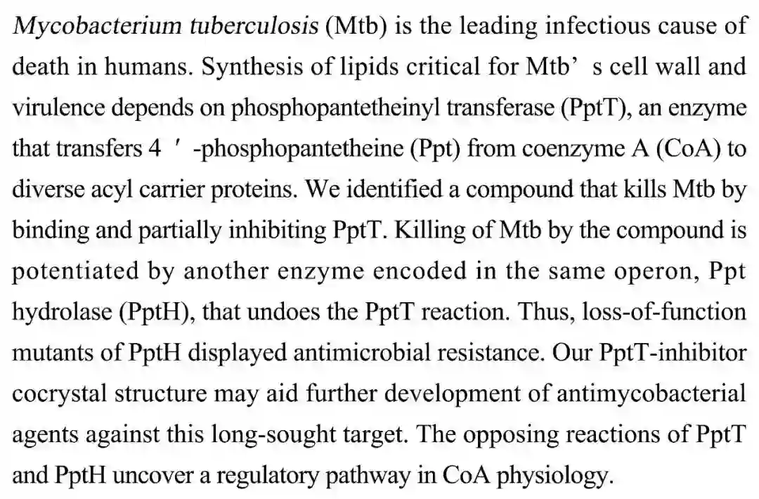 (导读 郭思瑶)结核分枝杆菌是造成人类感染死亡的重要原因。其细胞壁和毒力因子的合成依赖于磷酸泛酰巯基乙胺基转移酶(PptT)。科研人员发现一种成分可以通过结合并抑制PptT来杀死结核分枝杆菌。该杀菌效应可被磷酸泛酰巯基乙胺基水解酶(PptH)增强,而PptH缺失导致抗性。这对于抗结核新型药物的研发有重要启示。