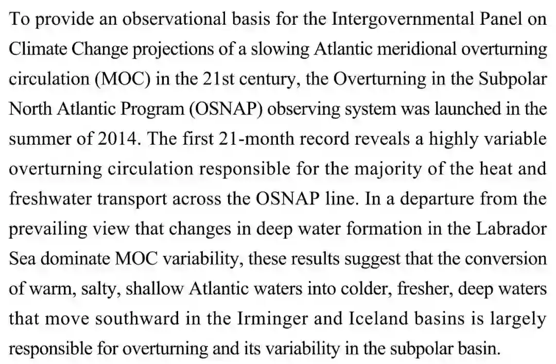 (导读 阿金)2014年夏季启动了北大西洋亚极地翻转环流项目(OSNAP)观测系统,最初21个月的纪录显示对热量与淡水跨OSNAP线输送的高度变化的翻转环流响应。研究结果表明大西洋浅层温暖咸海水注入向南流入伊尔名厄和冰岛盆地的更冷深层淡水中,是造成亚极地盆地翻转环流及其变化的主要原因。