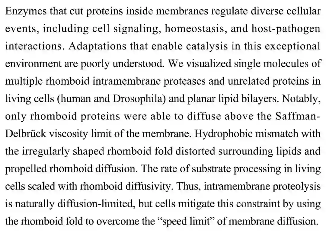 (导读 过泽远)在细胞膜内切割蛋白质的酶能调节不同的细胞活动,如细胞信号传导、内平衡和宿主-病原体的相互作用。本文通过观测了活细胞(人和果蝇)和平面脂质双层结构中多个细胞膜内的扁菱形蛋白酶和其他不相关蛋白质的单分子,发现只有扁菱形蛋白酶能扩散至Saffman-Delbruck黏度极限以上。厌水错配与不规则的菱形褶皱扭曲了周围的脂质并促进了扁菱形蛋白酶扩散。因此,虽然膜内水解蛋白受自然扩散的限制,但细胞利用扁菱形褶皱克服了膜扩散的“速度限制”。