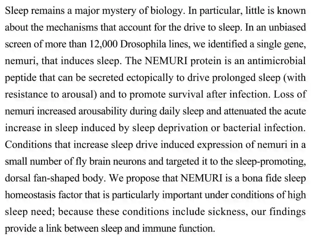 (导读 王思菲)驱动睡眠的机制仍有诸多未知。本研究通过无偏见筛选12000个果蝇株系发现nemuri基因可驱动睡眠。NEMURI作为异位分泌的抗菌肽可抵抗唤醒并延长睡眠,并促进感染后存活。Nemuri缺失增加日常睡眠中唤醒且减少因睡眠剥夺或细菌感染增加的睡眠急性需求。增加睡眠的条件下,nemuri在果蝇大脑中促眠背部扇形体神经元表达量增加。提示NEMURI是一种维持睡眠稳态因子,为睡眠和免疫功能建立联系。