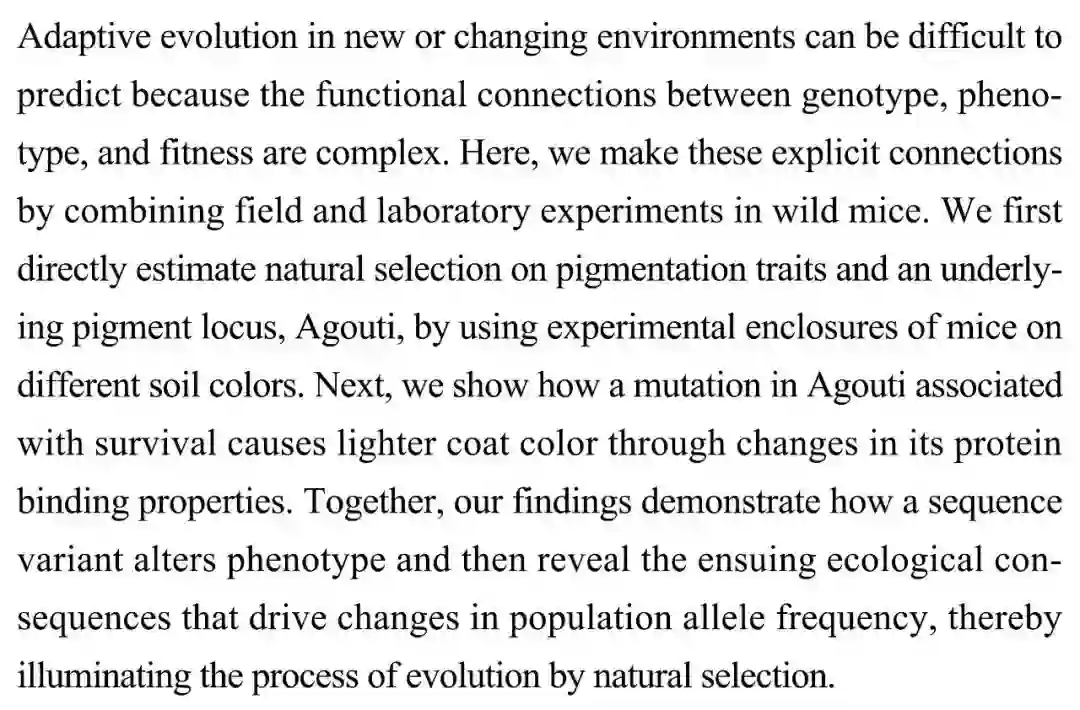 (导读 郭思瑶)由于表型,基因型,适应性之间的关系复杂,新环境中的适应性演化难以被预测。科研人员通过对野生型小鼠进行田间与实验室实验,利用不同土壤颜色直接估计色素性状及相关基因座Agouti的自然选择,并证明了Agouti上的生存相关突变如何通过改变蛋白质结合特性进而使毛色变浅。这说明了序列变化如何改变表型,进而导致驱动种群等位基因频率改变的生态后果,通过自然选择阐明了演化进程。