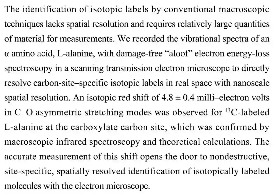 (导读 陈欣桐)检测同位素标记的传统技术存在不足。本文采用扫描透射电子显微镜结合电子能量损失谱法,在纳米级空间分辨率下对L-丙氨酸进行检测,结果显示碳13标记的羧基碳原子因为 C-O不对称伸缩振动出现4.8±0.4meV的同位素红移。该实验为运用电子显微镜实现具有空间分辨能力的位点特异性同位素标记无损分析提供了方向。