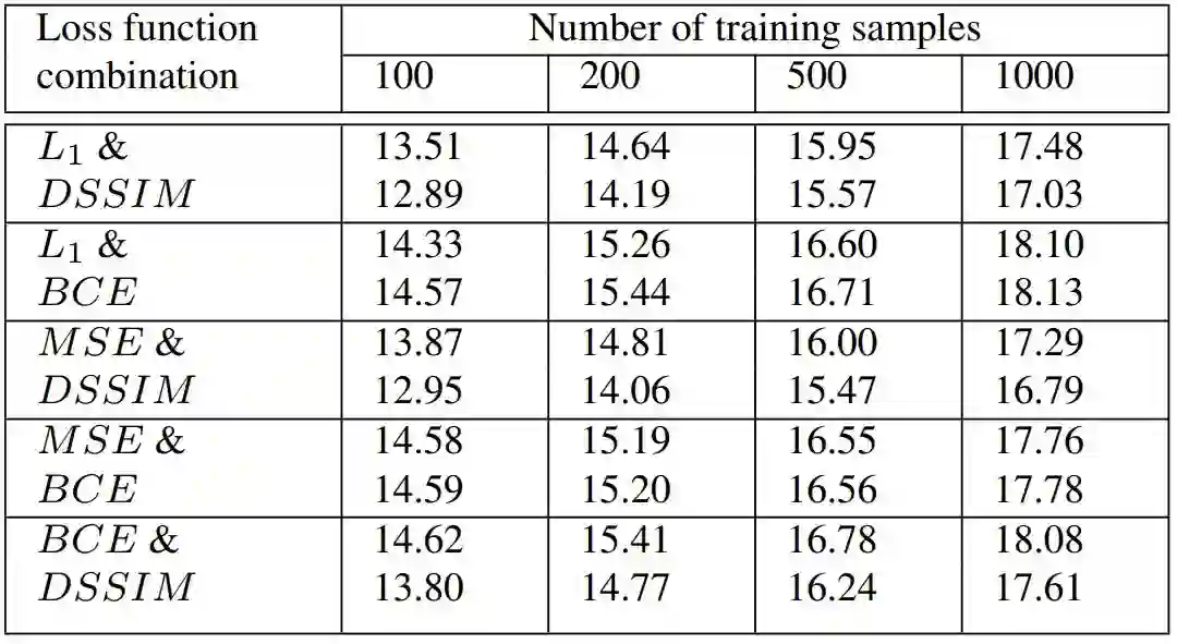 表 3:使用不同的损失函数组合时产生的每个重建结果的 PSNR 值。我们在这里用了两个解码器网络模型,每个解码器都有一个损失函数。对每一个损失函数组合来说,第一行的 PSNR 值对应第一个重建损失函数(用在第一个解码器中),第二行对应的是第二个损失函数(用在第二个解码器中)。