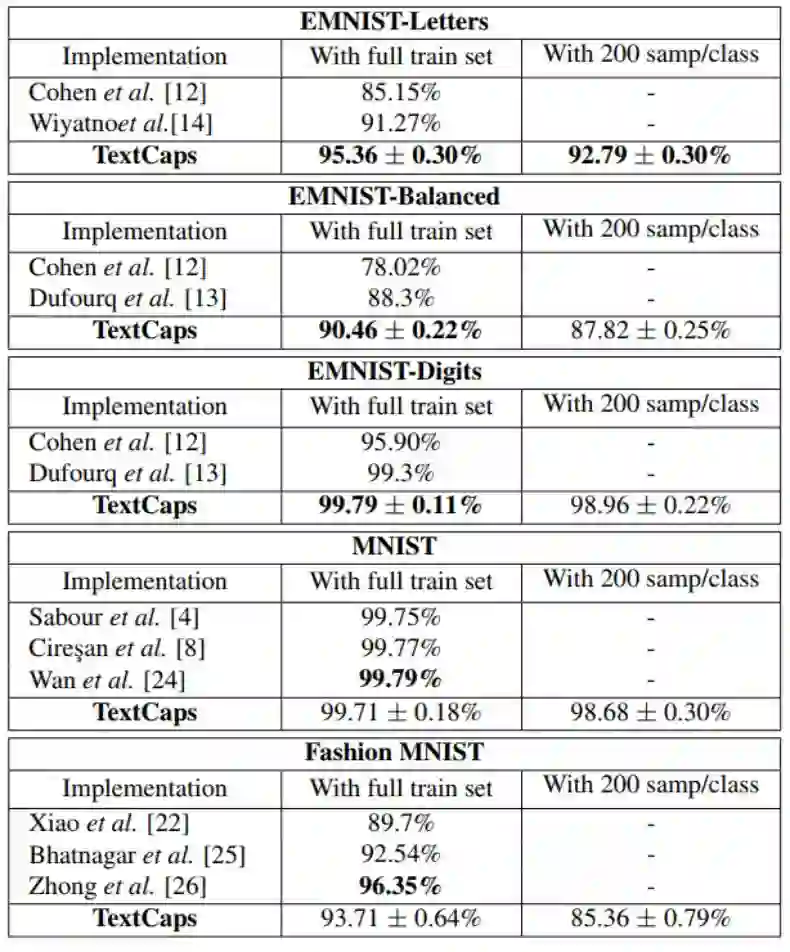 在所有可用训练样本上训练该系统后,在 EMNIST-letters、EMNIST-balanced 以及 EMNIST-digits 字符数据集上得到的结果都优于当前最佳结果;