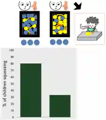 而在“选择取样”中,箱子里几乎全是黄色球,蓝色球很少。研究人员连续选择3个蓝色球,并示范将它们捏响。然后,递给婴儿一个黄色球。