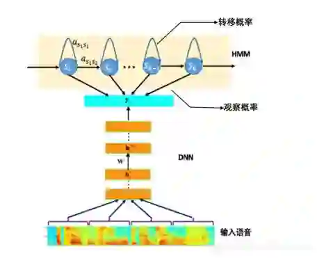 从输入到输出之间可以采用不同的神经网络结构,将输入的声学特征映射得到不同输出建模单元的后验概率,然后再结合HMM进行解码得到最终的识别结果。