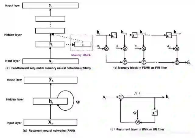 记忆模块采用如图 2(b)所示的抽头延迟结构将当前时刻以及之前 N 个时刻的隐层输出通过一组系数编码得到一个固定的表达。FSMN的提出是受到数字信号处理中滤波器设计理论的启发:任何无限响应冲击(Infinite Impulse Response, IIR)滤波器可以采用高阶的有限冲击响应(Finite Impulse Response, FIR)滤波器进行近似。从滤波器的角度出发,如图 2(c)所示的RNN模型的循环层就可以看作如图 2(d)的一阶IIR滤波器。而FSMN采用的采用如图 2(b)所示的记忆模块可以看作是一个高阶的FIR滤波器。从而FSMN也可以像RNN一样有效的对信号的长时相关性进行建模,同时由于FIR滤波器相比于IIR滤波器更加稳定,因而FSMN相比于RNN训练上会更加简单和稳定。