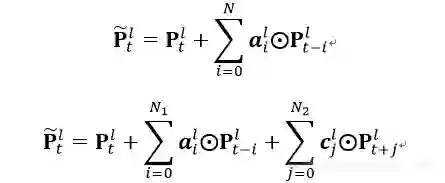 以上的FSMN只考虑了历史信息对当前时刻的影响,我们可以称之为单向的FSMN。当我们同时考虑历史信息以及未来信息对当前时刻的影响时,我们可以将单向的FSMN进行扩展得到双向的FSMN。双向的sFSMN和vFSMN记忆模块的编码公式如下:
