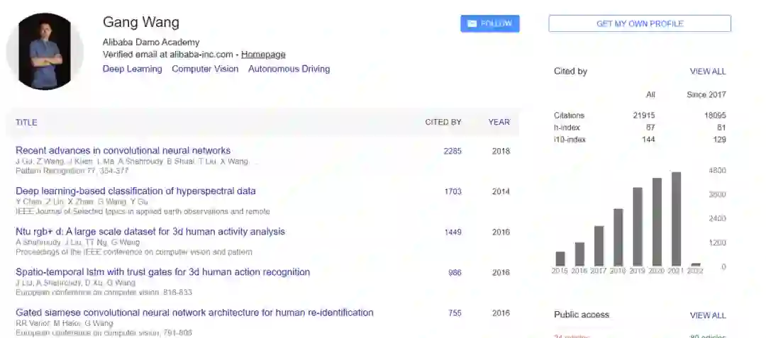 在学界,他也有很高的成就。Google Scholar 上的数据显示,王刚的论文被引量超过 20000,h-index 高达 67,是一位实打实的高被引学者。此外,他还是人工智能顶级期刊 IEEE TPAMI 编委以及人工智能顶会 ICCV、CVPR、ECCV 的领域主席。