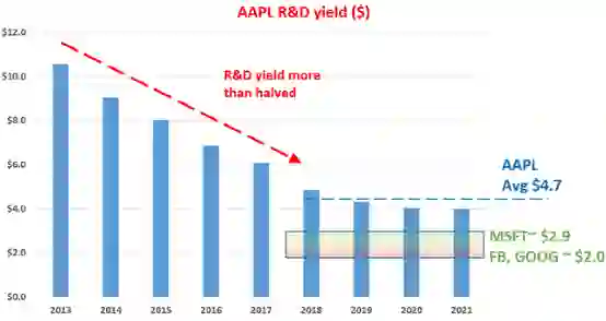 在这样的背景下,现在你可以看到,2013 年苹果的研发收益已经超过 10 美元,而近年来已经下降到 4.0 美元到 5.0 美元之间。您可能会将其研发产量的下降解释为坏消息。但是,请记住,A) AAPL 在本世纪初享有的盈利水平根本不可持续,B) 下降仅与其辉煌的过去有关。