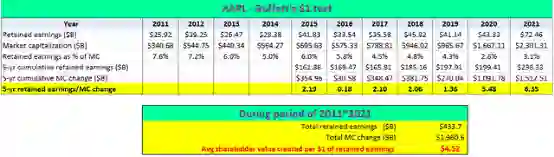 总体而言,在 2011~2021 年期间,AAPL 共保留了 $433B 的收益(令人难以置信的现金数额),其 MC 总共增加了 $1.96T(几乎是美国年度 GDP 的 1/10)。因此,在过去十年中,自从蒂姆库克接任 CEO 以来,每保留 1 美元的收益,就为股东创造了 4.52 美元的价值。
