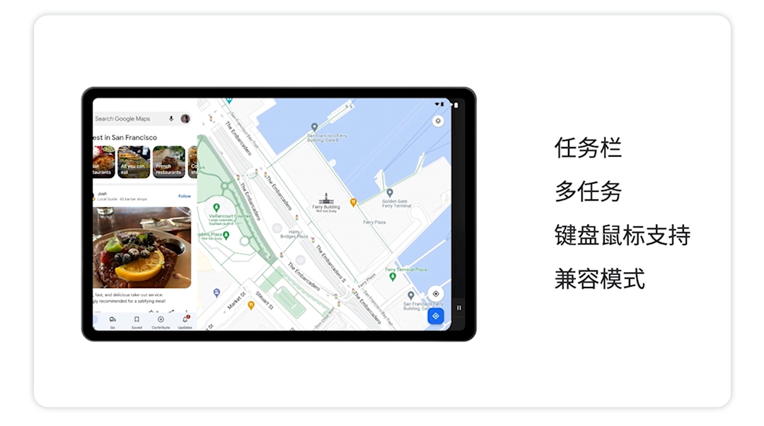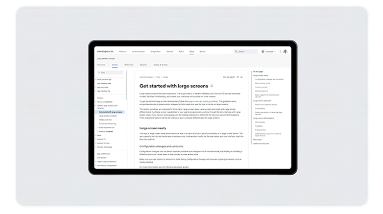 Android 还创建了一套 “大屏幕应用质量指南” 和 “Material Design 布局规范”,帮助开发者们优化基于大屏幕的应用。