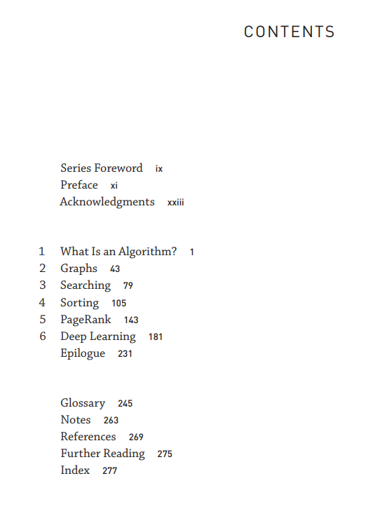 在讨论了算法的作用以及如何衡量其有效性之后,Louridas涵盖了三个最基本的应用领域:描述网络的图,从18世纪的问题到今天的社交网络;搜索,以及如何找到最快的搜索方式;以及排序,以及为特定任务选择最佳算法的重要性。然后他介绍了更大规模的应用: PageRank,谷歌的创建算法; 以及神经网络和深度学习。最后,Louridas描述了所有的算法都不过是笔和纸的简单动作,以及如何从这样一个不起眼的基础上崛起所有的辉煌成就。