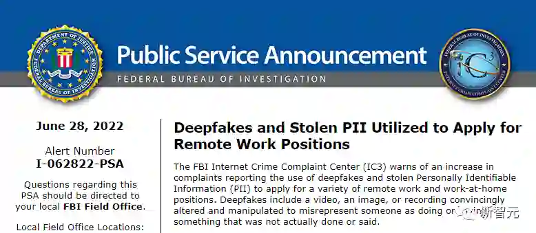 公告指出,FBI 互联网犯罪投诉中心 (IC3)最近收到的用Deepfake和「被盗个人身份信息」 (PII) 申请各种远程工作和在家工作职位的投诉有所增加。