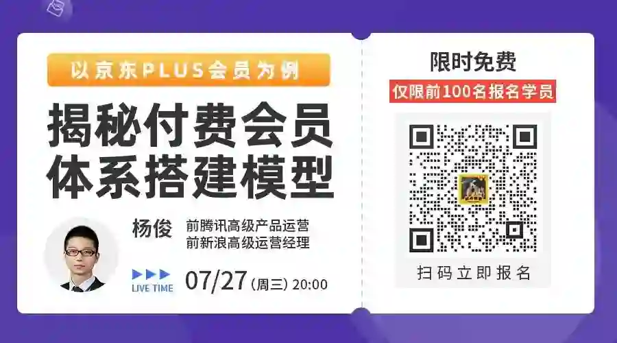 7月27日(周三)晚8点,前腾讯高级产品运营@杨俊老师,将会拆解京东PLUS会员背后的运营增长逻辑,教你会员权益搭建的方法!