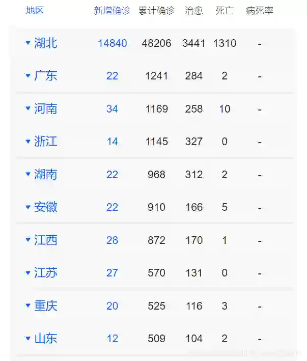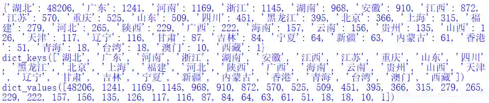 37# {'湖北': 48206, '广东': 1241, '河南': 1169, '浙江': 1145, '湖南': 968, ..., '澳门': 10, '西藏': 1}
