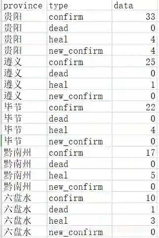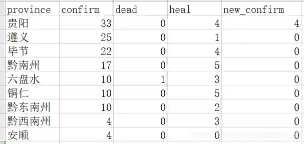 6{'name': '贵阳', 'today': {'confirm': 4, 'suspect': 0, 'dead': 0, 'heal': 0, 'isUpdated': True}, 'total': {'confirm': 33, 'suspect': 0, 'dead': 0, 'heal': 4, 'showRate': False, 'showHeal': True, 'deadRate': 0, 'healRate': 12.12}}