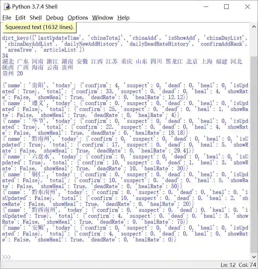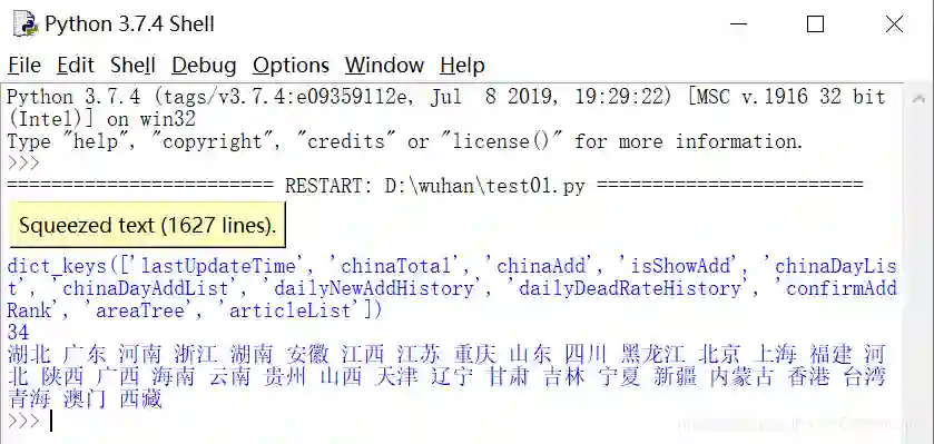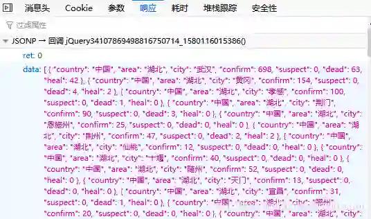 通过分析url地址、请求方法、参数及响应格式,可以获取Json数据,注意url需要增加一个时间戳。下面代码展示了获取数据的键值及34个省份。