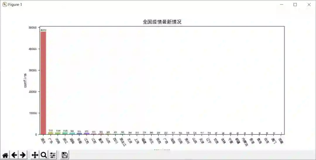 注意,初始化每个省份人数为0,然后循环累加该省所有城市的确诊人数,调用 city_data[‘total’][‘confirm’] 获取各城市的确诊数据。