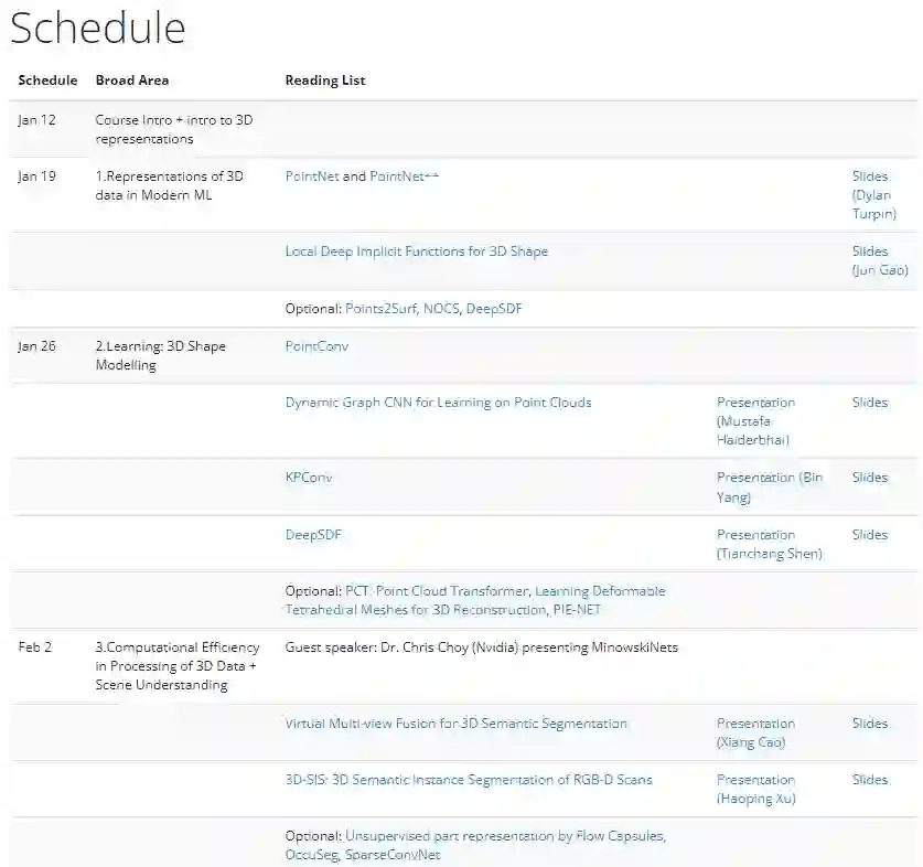 CSC 2547 是多伦多大学的一门课程,主要介绍了几何深度学习方法和 3D 视觉的最新进展。近期 2021 年冬季的 CSC 2547 课程已全部上线,课程视频和讲义资料均公开可看。