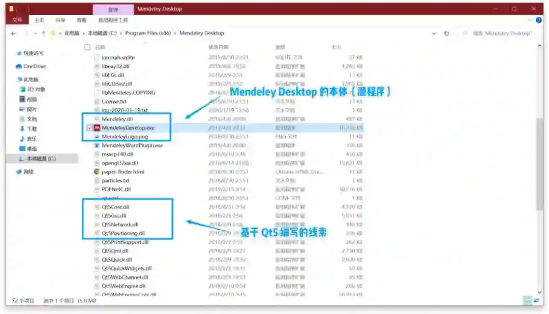 字样的 DLL 文件的蛛丝马迹,这些线索表明 Mendeley 客户端很大可能是直接使用跨平台 UI 框架 Qt 编写的,验证了我们的猜想。