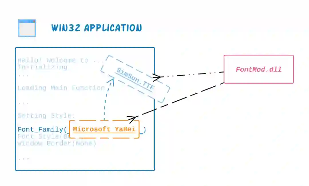 事实上,FontMod 的工作原理非常简单易懂,和一些游戏外挂的原理类似。我们可以这样理解:FontMod 就是一个专门修改应用程序字体「外挂」,都是利用在原有程序的执行的基础之上,加载我们自己的 DLL。那么,这样的话,我们就可以在 DLL 中将应用程序字体渲染的部分逻辑进行修改,使得应用程序使用我们指定的字体进行显示。