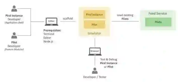 Piral 所要求的前提条件相当宽松,开发人员仅需要安装喜欢的编辑器、终端、网络浏览器和 Node.js 即可。开发者可以在本地开发机的仿真器中执行和调试 Piral instance(应用程序外壳)和 piltes(功能模块)。
