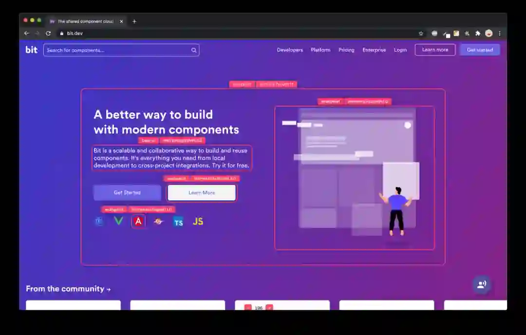如果查看 bit.dev 主页,你会发现它由很多独立的组件构成。这些组件由不同团队,在不同代码库中构建,并最终集成在一起,创造了一个紧密结合的产品。