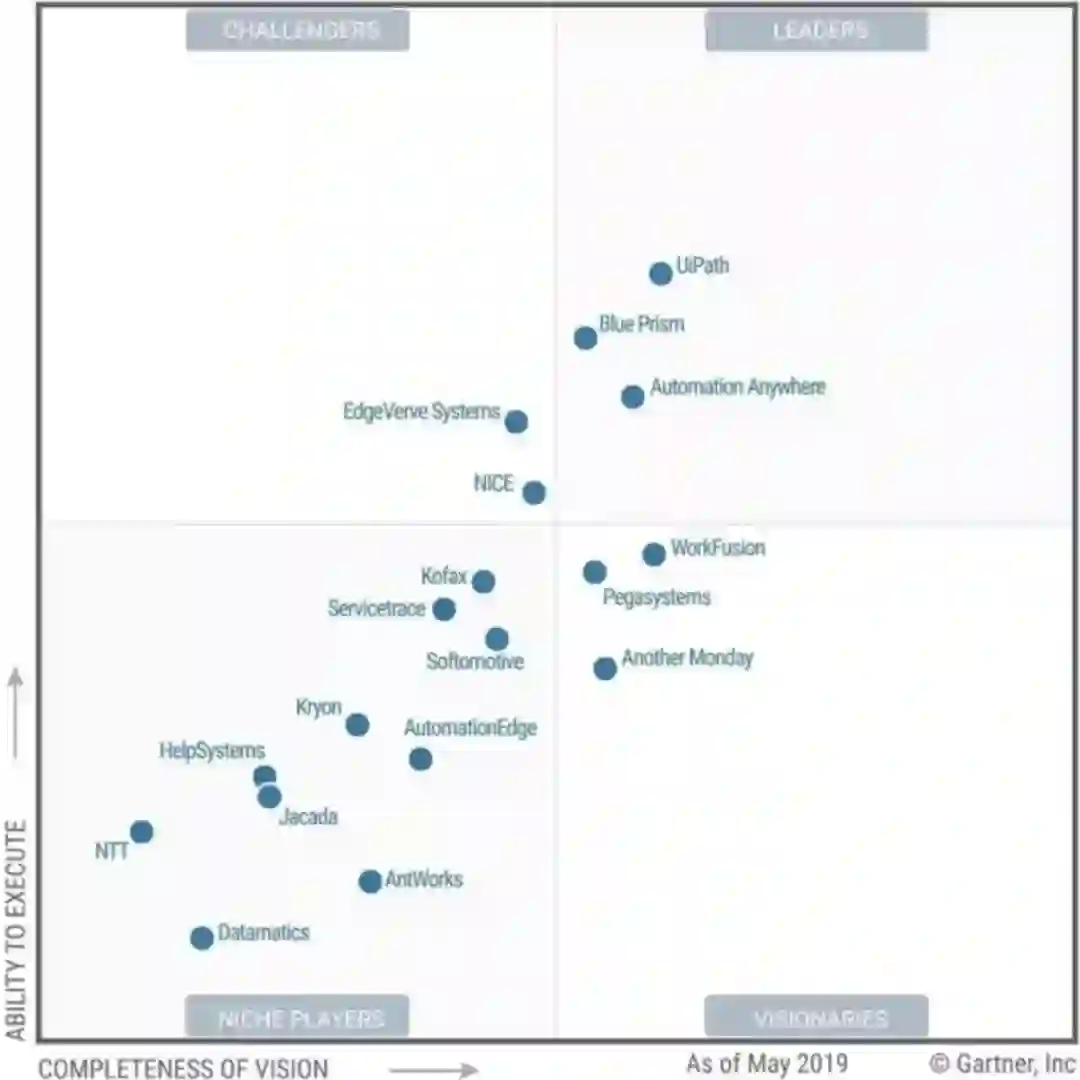 7月份,Gartner发布了RPA行业首份魔力象限报告。该报告,通过市场趋势、市场发展、企业参与度、应用趋势等多个维度,对全球的RPA供应商进行了评估。