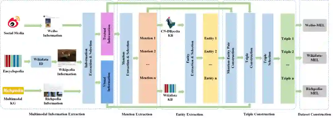 为了构建大规模MEL数据集,促进相关研究,我们提出了一种MEL数据集构建方法,包括五个阶段,如下图所示。在多模态信息抽取阶段,我们选择不同的现实世界多模态数据源,提取文本和视觉信息;在提及抽取阶段,我们从文本信息中获取提及,并保留可能存在相应实体的提及;在实体抽取阶段,我们用上一阶段保留的提及查询知识图谱,收集相关实体列表,并保留提及相应的实体;在三元组构建阶段,我们将相应的提及和实体合并为提及-实体对,并将它们与多模态信息抽取阶段获取的文本和视觉信息合并为MEL三元组;最后,在数据集构建阶段,我们按照7:1:2的比例,将数据分为训练集,验证集和测试集。